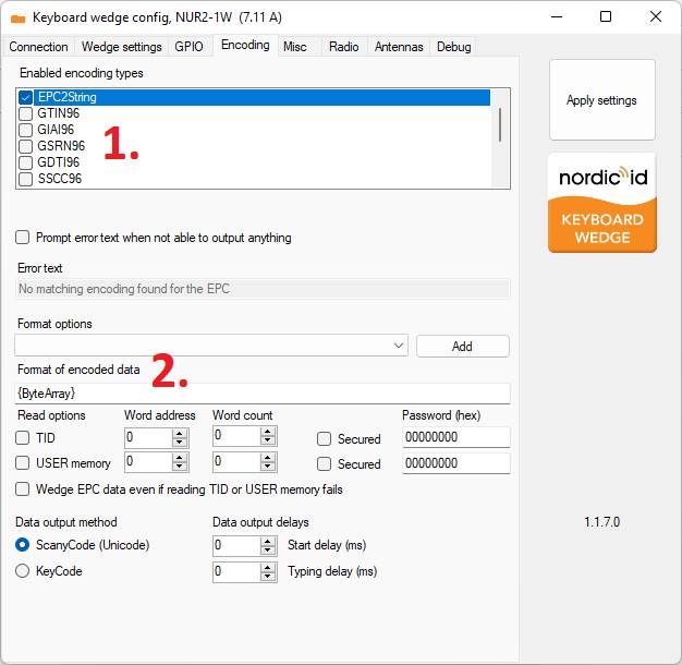 From the following screen, disable all other encoding methods except EPC2Stings. "Format of encoded data" controls which information the NurWedge sends. {ByteArray} send EPC as HEX codes while {ASCIIEPC} converts EPC to ASCII characters: